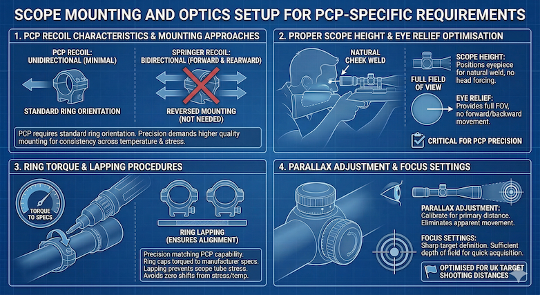 PCP recoil characteristics require different scope mounting approaches than springer rifles due to the absence of dual-direction recoil forces. PCP rifles typically require standard scope ring orientation without the reversed mounting needed for springer applications, simplifying scope mounting whilst maintaining zero consistency. However, the precision capability of PCP systems demands higher quality scope mounting that maintains zero across temperature variations and mechanical stress.