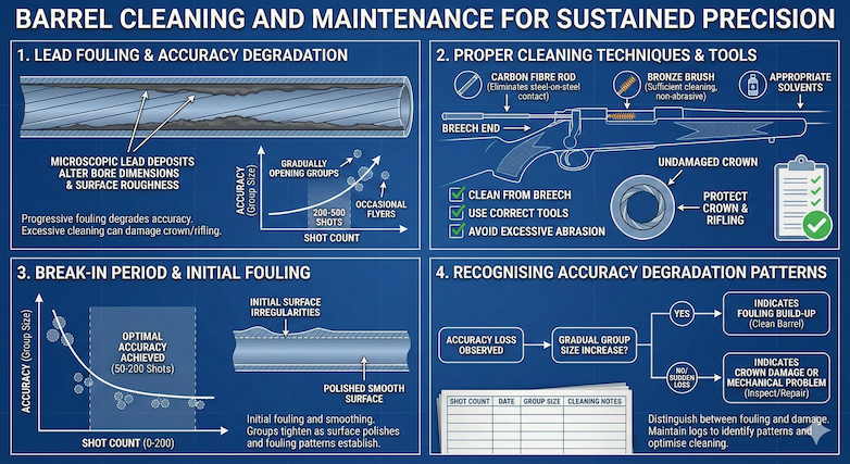 Recognising accuracy degradation patterns enables distinguishing between correctable maintenance issues and permanent barrel wear. Gradual group size increases typically indicate fouling build-up, whilst sudden accuracy loss may indicate crown damage or mechanical problems. Maintaining shot count and accuracy logs enables identifying degradation patterns and optimising cleaning schedules for sustained precision performance.
