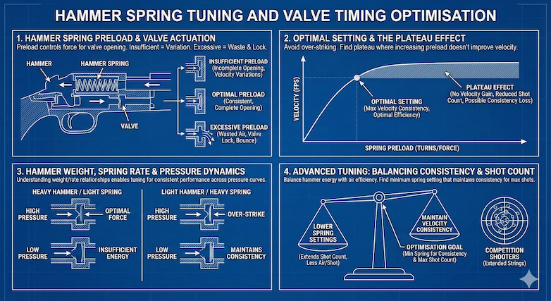 Hammer spring preload directly affects valve opening duration and shot consistency by controlling the force available for valve actuation. Insufficient preload results in incomplete valve opening and velocity variations, whilst excessive preload wastes air and may cause valve lock that prevents proper closing. The optimisation process requires systematic adjustment whilst monitoring chronograph testing results to identify settings delivering maximum velocity consistency with optimal air efficiency.