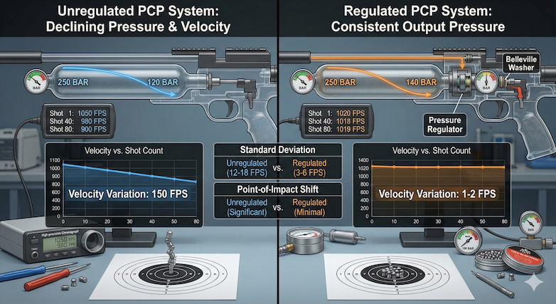 Unregulated PCP systems exhibit velocity curves that start high with full reservoir pressure and gradually decline as air pressure drops, creating systematic accuracy degradation across shot strings. Chronograph testing of quality unregulated rifles typically shows initial velocities 30-50 FPS higher than end-of-string velocities over 80-shot sequences, with corresponding point-of-impact shifts that open groups significantly.