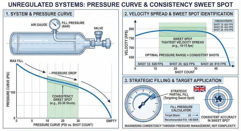 Fill pressure calculators help optimise unregulated performance by determining exact fill pressures that provide target shot counts within optimal pressure ranges. Rather than filling to maximum pressure and accepting the entire velocity curve, strategic partial fills can position the majority of shots within the rifle’s accuracy sweet spot, effectively creating consistency advantages without regulator complexity.