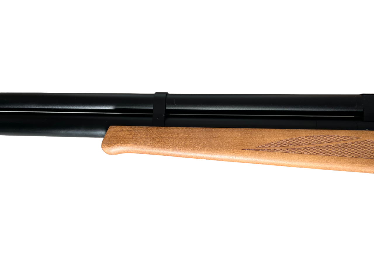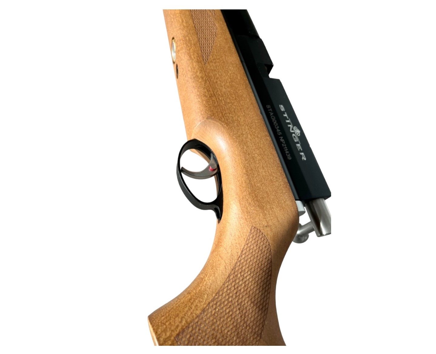 This PCP bolt action rifle, fitted with a suppressor and rotary fed magazine is perfect for junior shooters who want to take their shooting to the next level. The rifle is equipped with a slow-release valve to ensure a smooth powerful shot with no recoil. It truely is a hallmark of precision, power, and reliability, designed to elevate your shooting experience to new heights. Crafted with the finest engineering and an emphasis on performance, this air gun stands as a testament to innovation in the world of shooting sports  With real wood stock, and scope rail the Stinger PCP Juno Air Gun is highly recommended.